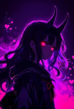 NLSTN. This is a vibrant, digital illustration in a neon-lit NLSTN anime style. The central figure is a young girl with long, wavy hair that blends into a dark, almost demonic aura. She has two prominent, curved horns protruding from her forehead, adding to her eerie appearance. Her eyes are a striking, glowing red, giving an intense, otherworldly glow.