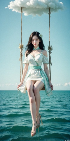 surreal warm cinematic full body shot photography, Kodak Professional Portra 160, 真人肌肤纹理, 4K画质,完美身材,long legs,big_breasts,navel,,Film texture,, film and television, surrealism, a girl with a delicate face is sitting on a cloud swing. The girl is wearing white dress,green dress , light blue stripes trimming, , exquisite diamond-encrusted high heels, swing rope The sub is connected to a cloud in the sky, the background is a vast ocean, the water shows a consistent blue-green tone, the sky is also blue-green, blending with the ocean, perfect light and shadow, hyper-realistic photography, sharpening, artistic conception, Consciousness, large areas of blank space, sense of space, haziness, dreams, fog,