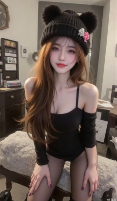 1 Taiwanese girl,1girl, solo, long hair, breasts, looking at viewer, blush, smile, waist length scarlet hair, wearing a bear woolen hat,dress, cleavage, bare shoulders,leaning forward, purple eyes, flower, pantyhose, boots, detached sleeves, armpits, nail polish, black dress, black pantyhose, black headwear, purple nails, selfie
