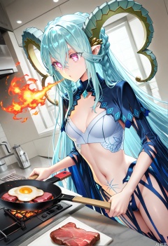 larva tiamat \(third ascension\) \(fate\), fate/grand order, 1girl, curled horns, pointy ears, long horns, hair on horn, hair between eyes, pink eyes, symbol-shaped pupils, x-shaped pupils, very long hair, aqua hair, blue hair, braid, sidelocks, thighs, navel, stomach tattoo, thighhighs, blue shirt, crop top, shrug \(clothing\), no gloves, cooking, spatula, frying pan, meat, fried egg, vegetable, (blowing, breathing fire, flame, burning,:1.1) perspective, dutch angle, close-up, indoors, kitchen, (redrop:0.7), (wada arco:0.6), (aora:0.5) ,masterpiece,best quality,amazing quality, , epic composition, epic proportion, dynamic angle, , masterpiece,best quality,amazing quality,very aesthetic,absurdres,newest,kawaiiShoujo,perfect hands,OverCute,animepastelz