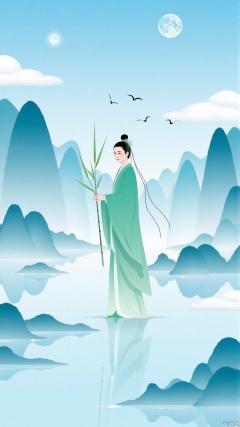 JYZGF, an ancient woman with graceful figure, wearing a light green flowing robe, with a tall bun and a strand of long hair hanging down. She holds bamboo long leaf props and stands quietly between mountains and rivers. The background is a continuous mountain in the light blue ink style. The mountains are covered with clouds and mist. The water surface is as calm as a mirror reflecting the mountain colors. Birds are flying in the sky, and a hazy full moon hangs in the distance. The overall picture is fresh and elegant in color, and adopts a simple illustration style.