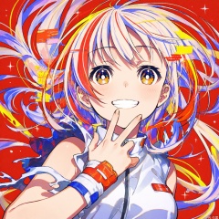 A dynamic anime-style illustration features Mika Piazo, a vibrant character with flowing hair boasting intricate patterns and designs. Large, expressive eyes graduate from red to blue to yellow, radiating liveliness. A sleeveless white top accentuates her cheerful smile, as she holds up one hand in a playful pose, fingers splayed. Against a solid red background, the character's colorful attire pops, drawing attention to her stunning locks.