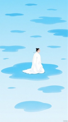 JYZGF, an ancient man with hair tied up, wearing a pure white robe, kneeled quietly on the light blue ground with a natural-shaped puddle. The picture is mainly cool blue, surrounded by light blue water marks of different shapes. The overall style is simple and fresh, creating a quiet and contemplative atmosphere.