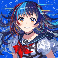 The image depicts a vibrant anime-style character with striking blue and red hair