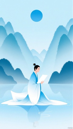 JYZGF, A young man with hair tied up, wearing a flowing robe with mostly white and blue brides, kneels on the water, holding a white object in both hands. The background is a blue round sun hanging in the light blue sky, and blue-green ink-style mountains with varying shades, creating a quiet and distant Chinese artistic conception. The overall picture is a simple illustration style.