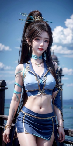 ,Short skirt,Blue sky, white clouds, ocean, nai3, 1girl, solo, crop top, , choker, navel, shirt, midriff, crop top overhang, looking at viewer, white shirt, jewelry, breasts, bare shoulders, off-shoulder shirt, off shoulder, black choker, thighs, stomach, long hair, bracelet, short sleeves, ribbon, hand up, collarbone, hair ribbon, medium breasts, , bra strap, , hair ornament, thigh gap, necklace, expressionless, ,qinglin,blue_eyes,High ponytail