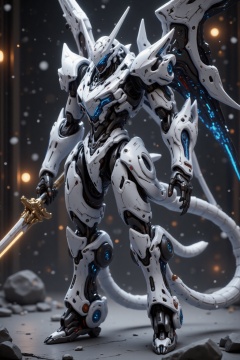 Mechanical metallic texture,This is a highly detailed CGI image of a futuristic, anthropomorphic robot with a sleek, metallic body in white and black. The robot has large, angular wings and a glowing blue core. It holds a glowing sword with a golden hilt. The background features a dark, industrial setting with blurred, colorful lights and falling snow. The robot's design is reminiscent of sci-fi mecha, blending organic and mechanical elements.