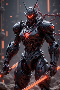 Mechanical metallic texture,Rendered by Unreal Engine 5,This is a science-fiction-style picture showing an image of a warrior wearing a black mech. The body structure of a mecha soldier is complex,with multiple joints and sharp edges,giving people a strong and majestic feeling. Its eyes glow red and it holds two glowing red weapons in its hands. There are some smoke and beam effects in the background,adding to the fighting atmosphere. The overall picture is full of a sense of technology and future.,highly detailed,ultra-high resolutions,32K UHD,best quality,masterpiece,