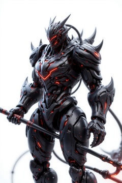 Mechanical metallic texture,Rendered by Unreal Engine 5,This is a science-fiction image showing a character wearing black mechanical armor and holding a trident with a red glow. The character's helmet has a sharp design,and the overall shape is full of futuristic and technological sense. The background is white,highlighting the character's outlines and details. The light of the image is soft,creating a mysterious and tense atmosphere.,highly detailed,ultra-high resolutions,32K UHD,best quality,masterpiece,
