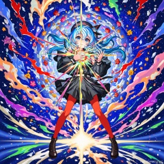 The image depicts a vibrant and dynamic scene with a central character surrounded by a swirl of colorful, abstract shapes. The character has blue hair and is wearing a black outfit with a frilly skirt and red stockings. They are standing on a surface that resembles a planet, with a bright light emanating from the bottom center of the image. The background is filled with a variety of colors, including blues, purples, reds, and greens, creating a sense of motion and energy. There are also small, colorful objects scattered throughout the scene, which appear to be floating or moving around the character. The overall composition is very lively and visually striking, with a mix of sharp and soft elements that create a sense of movement and dynamism.