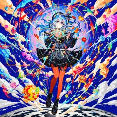 The image depicts a vibrant and dynamic scene with a central character surrounded by a swirl of colorful, abstract shapes. The character has blue hair and is wearing a black outfit with a frilly skirt and red stockings. They are standing on a surface that resembles a planet, with a bright light emanating from the bottom center of the image. The background is filled with a variety of colors, including blues, purples, reds, and greens, creating a sense of motion and energy. There are also small, colorful objects scattered throughout the scene, which appear to be floating or moving around the character. The overall composition is very lively and visually striking, with a mix of sharp and soft elements that create a sense of movement and dynamism.