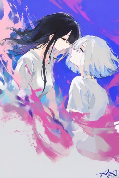ezu,Digital painting of two young women facing each other,one with short white hair and the other with long black hair,both with blue eyes and fair skin. They are wearing white and black shirts,respectively. The background is a blend of blue,purple,and pink hues with splashes of color. The style is whimsical and ethereal,with a dreamy and surreal atmosphere. The women have delicate features and are looking at each other with a calm and serene expression. The artwork is signed by the artist "Rim" in the bottom right corner.,
