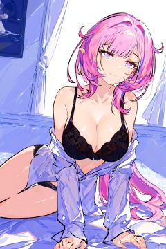 elysia \(honkai impact\),1girl,solo,long hair,breasts,separate_shirt,hei_black lace bra,hei_black lace panties,frills,shiny skin,looking_at_viewer,bedroom,caustics,white_background,very_aesthetic,highres,high_definition,sensitive,best_quality,masterpiece,illustration,