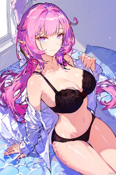 elysia \(honkai impact\),1girl,solo,long hair,breasts,separate_shirt,hei_black lace bra,hei_black lace panties,frills,shiny skin,looking_at_viewer,bedroom,caustics,white_background,very_aesthetic,highres,high_definition,sensitive,best_quality,masterpiece,illustration,