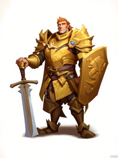 OMKT, Digital portrayal of a majestic dragonborn paladin in shining scale armor, holding a holy sword aloft in one hand and a shield emblazoned with a dragon emblem in the other. His scales are a brilliant gold, and his eyes glow with righteous fury. The background is a pure white, and the art style is heroic and cartoonish, with strong, defined outlines and vivid colors.