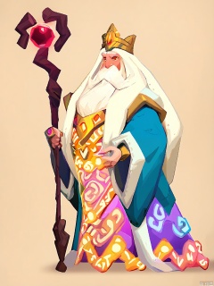 OMKT, Digital illustration of a wise old wizard in a flowing blue robe, holding a staff adorned with mystical runes. His long white beard flows down to his chest, and his eyes twinkle with wisdom. The background is a plain white, and the artwork has a whimsical, cartoony feel with soft lines and pastel hues.