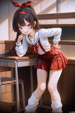 smug,fang,long hair,brown hair,ponytail,high ponytail,black eyes,skin fang,blush,school uniform,skirt,red skirt,loose socks,socks,red bow on hair ribbon,red bow hairband,shirt,long sleeves,pleated skirt,suspender skirt,white sailor_collar,flat chest,solo focus,school desk,doyagao,