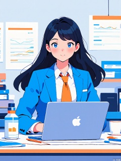 BPCH, Digital drawing of a woman sitting at a desk in an office, working on a laptop. She has long black hair and is wearing a blue suit with a white shirt and orange tie. The desk has a MacBook, a water bottle, a coffee cup, and a pen. The background has a wall with charts and graphs. The style is clean and modern, with bright colors.