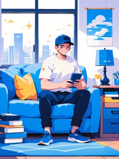BPCH, A digital illustration of a young man sitting on a blue couch, wearing a blue cap, white t-shirt, dark blue pants, and blue sneakers, holding a smartphone. The background features a large window with a cityscape view, a blue lamp on a side table, and a poster of a blue sky with clouds. The art style is clean and modern, with a soft color palette and a relaxed atmosphere.