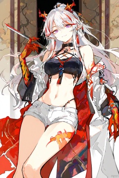 line art,Detail enhancement,Simple Flat Coloring,Nai3 style,masterpiece,facing the lens,best quality,very aesthetic,extremely delicate and beautiful,huge filesize,amazing quality,32K UHD,fashionable,cool and fashionable,1girl,solo,nian (arknights),horns,shorts,white hair,purple eyes,pointy ears,navel,midriff,open coat,long hair,looking at viewer,streaked hair,bracelet,red hair,bangs,earrings,breasts,legs_together,(Arm tattoo),Ink painting background,masterpiece,best quality,amazing quality,very aesthetic,absurdres,best quality,newest,extreme aesthetic,masterpiece,best quality,good quality,very aesthetic,absurdres,A shot with tension,impactful picture,offcial art,movie perspective,smile,white_background,simple_background,