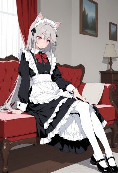 masterpiece,best quality,amazing quality,very aesthetic,absurdres,newest,very awa,painting \(medium\),(flat color:1.1),indoors,couch,curtains,1girl,solo,grey hair,pink eyes,cat ears,maid,white apron,frilled dress,very long dress,long sleeves,wrist cuffs,red bowtie,white pantyhose,mary janes,sitting,hand on own thigh,arm support,