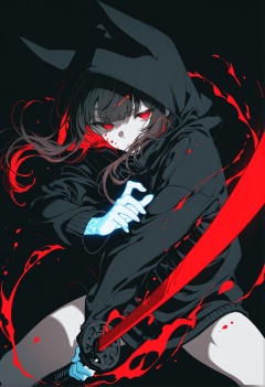 masterpiece,best quality,amazing quality,very aesthetic,absurdres,newest,(yoneyama mai),(noyu (noyu23386566)),(wanke:1.1),(senpen:1.1),lineart,monochrome,(red sword:1.2),(fighting stance:1.2),(disheveled hair:1.1),(dark theme:1.2),chiaroscuro,foreshortening,(colorful splashes:1.1),(shining:1.1),(focus on face:1.1),Glowing skin,Strong contrast,long sleeves,simple background,red eyes,weapon,hood,black background,sword,hooded jacket,jacket,hood up,red long hair,glowing,half-closed eyes,looking at viewer,