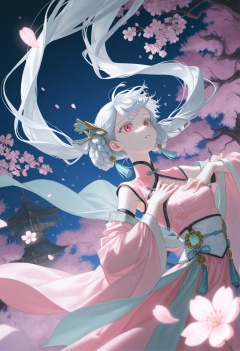 1girl,solo,short hair,bangs,breast,hair ornament,dress,Upper body,Peach blossom eyes,white hair,outdoors,detached sleeves,white and pink dress,tree,petals,night,flower,parted lips,hands on own chest,cherry blossoms,scenery,spread arms,dancing,falling petals,braid,twintails,off shoulder,very long hair,hair bun,chinese clothes,tassel,jinhsi,(artist:quasarcake:0.8),extreme aesthetic,best quality,good quality,newest,very aesthetic,absurdres,Visual impact,Electromotive force,perspective composition,A shot with tension,ultra-high resolution,32K UHD,sharp focus,best quality,masterpiece,Emotionalization masterpiece,unconventional supreme,masterful details,with a high end texture,in the style of fashion photography,(Visual impact:1.2),