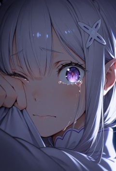 best_quality,masterpiece,newest,year 2024,year 2023,very aesthetic,absurdres,impactful picture,offcial art,movie perspective,(yoneyama mai:0.5),(WANKE:0.5),dark,emilia_(re:zero),re:zero_kara_hajimeru_isekai_seikatsu,1girl,purple_eyes,x_hair_ornament,face close-up,eye focus,looking_back,tears,wiping_tears,close one eye,