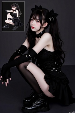 1girl,solo,long hair,looking at viewer,black hair,thighhighs,gloves,dress,twintails,elbow gloves,black footwear,black eyes,black dress,squatting,personification,gothic,reference inset