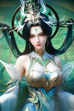 1girl, solo, long hair, looking at viewer, black hair, hair ornament, dress, bare shoulders, jewelry, closed mouth, upper body, earrings, forehead mark