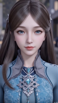 1girl, long hair, solo, dress, brown hair, jewelry, blue dress, blue eyes, hair ornament, mischevious smile, perfect body, scenery, sharp focus, best quality, masterpiece, detailed outfit, illustration, perfect eyes, finely detailed beautiful anime eyes, realistic skin, intricate details, best lighting, depth of field, ultra high resolution,cowboy_shot
