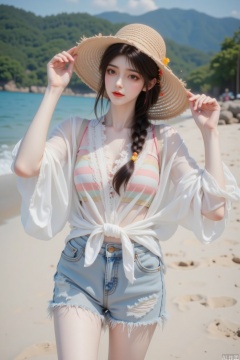 Her posture is elegant and confident, with both hands gently supporting her straw hat, lifting her head slightly, and looking at the camera with her eyes, as if engaged in silent communication with the viewer. The background is a beautiful beach, with delicate sand shimmering with golden light under the sunshine. Not far away is the deep blue sea, with waves gently crashing against the shore, making pleasant sounds. Further away are lush forests, with green vegetation complementing the blue sky and sea, creating a picturesque natural scenery. The entire scene is filled with youthful vitality and a romantic vacation atmosphere, making people feel the beauty and comfort of summer.