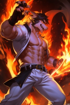 solo, short hair, shirt, gloves, dragon furry,1boy,solo, holding, animal ears,fire tail, weapon, male focus, open clothes, teeth, belt, pants, fingerless gloves, muscular, fire, pectorals, muscular male, bara, claws, furry, fighting stance, white pants, furry male,character:WuXuan(holy)
