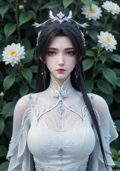 This image depicts a very meticulous and elegant character wearing elegant and complex costumes. The character wears a delicate silver headdress with the decoration in the center resembles a star or floral pattern. The clothing is mainly white with subtle blue accents, giving it a quiet and ethereal look. The characters' hair is long and black, pouring down from their shoulders, and they wear a turtleneck outfit with ornate patterns including swirl designs and floral patterns. The overall aesthetic is very artistic and inspired by fantasy, focusing on elegance and beauty