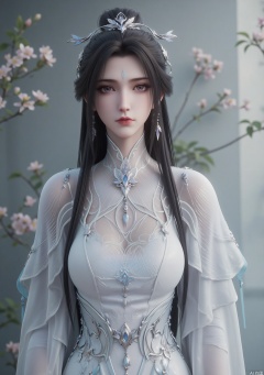 He wore a flowing and complex high-necked skirt, which was mainly white with subtle blue embellishments, giving it a quiet and ethereal appearance. His body aesthetic is very artistic and fantasy-inspired, focusing on elegance and beauty."