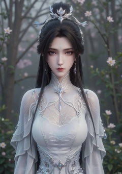 He wore a flowing and complex high-necked skirt, which was mainly white with subtle blue embellishments, giving it a quiet and ethereal appearance. His body aesthetic is very artistic and fantasy-inspired, focusing on elegance and beauty."