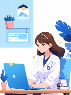BPCH, Digital illustration of a young woman with long brown hair, wearing a white lab coat over a navy blue shirt, sitting at a desk and working on a blue laptop. She has a friendly expression and is looking at the laptop screen. The background features various blue tropical plants with large leaves, and a small potted plant on the desk. The overall color scheme is light and soothing, with shades of blue and white. The style is clean and modern, with a focus on simplicity and clarity.