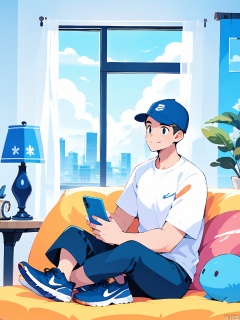 BPCH, A digital illustration of a young man sitting on a blue couch, wearing a blue cap, white t-shirt, dark blue pants, and blue sneakers, holding a smartphone. The background features a large window with a cityscape view, a blue lamp on a side table, and a poster of a blue sky with clouds. The art style is clean and modern, with a soft color palette and a relaxed atmosphere.