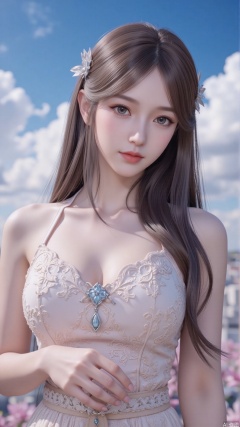 Very detailed face, extremely detailed eyes and face, (vacuum), 8K wallpaper, light leak, beautiful and detailed girl, extremely detailed CGUnity8K wallpaper, an extremely detailed and beautiful, beautiful and detailed eyes, masterpiece, best quality, Real photo level, (frontal shooting panoramic perspective), ( (Full body photo)), dynamic angle, dynamic pose, solo, ancient style silver hairpin with petals, blue sky and white clouds, (C cup), (huge round breasts), slender legs, super good figure, stunning beauty, (whole body in the mirror) , (wearing Lolita nightgown), (light reflects the shadow of the body through the clothes),vacuum,bare and smooth