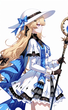 Phoebe\(wuthering waves\),1girl,gloves,blonde hair,long hair,solo,hat,black gloves,holding,bow,white headwear,white background,staff,long sleeves,profile,from side,hair bow,skirt,dress,holding staff,black bow,hair ornament,white dress,blue bow,black skirt,cowboy shot,simple background,<lora:xl-ill-Phoebe(wuthering waves)_v1-000008:0.8>,sheya,