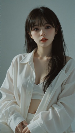 depth of field,detailed light,blurry background,best shadow,shiny skin,cinematic lighting,ray tracing, amazing quality,very aesthetic,absurdres,beast quality,ultra detailed,newest,8K,HDR,A captivating 35mm film shot unfolds,1girl,solo,Keywords long black hair, makeup, portrait, black eye shadow, off-the-shoulder, cleavage,White shirt coat, clothes open, navel,A captivating 35mm film shot unfolds,1girl,solo,Keywords long black hair, makeup, portrait, black eye shadow, off-the-shoulder, cleavage,White shirt coat, clothes open, navel