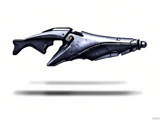 QXL, Digital art of a futuristic, high-tech firearm, resembling a cross between a pistol and a rifle, with a sleek, metallic design. The weapon has a silver and black color scheme, with a prominent black grip and a silver barrel. There are intricate details and textures on the surface, giving it a polished, industrial appearance. The background is a simple gradient from light grey to white, with a subtle shadow beneath the weapon, suggesting it is hovering or floating. The style is clean and modern, with a focus on mechanical elegance and advanced technology.