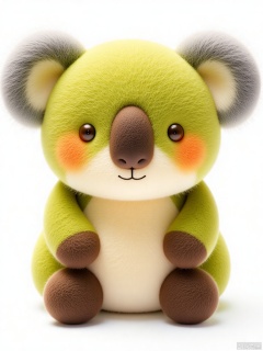 YMZ, a wool felt koala with fur in a gentle gradient from eucalyptus green at the head to moss, khaki, beige, and soft gray at the feet. The koala has a creamy white belly, dark brown paws, and a button nose. Its eyes are deep brown and sleepy, framed by fluffy ears. Against the white background, it looks cuddly and peaceful.