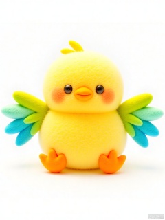 YMZ, a wool felt chick with feathers in a cheerful gradient from bright yellow at the head to lemon, soft green, sky blue, and pastel pink at the wings. The chick has tiny black eyes and an orange beak. Its expression is joyful and full of life, set against the clean white background.