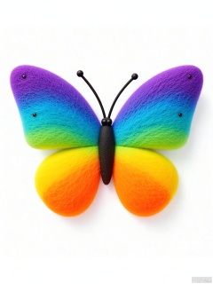 YMZ, a wool felt butterfly with wings in a vibrant gradient, starting from deep purple at the tips and blending through blue, turquoise, green, yellow, and finally orange at the body. The butterfly has delicate black antennae and tiny black eyes. Against the white background, it looks like it's about to take flight.