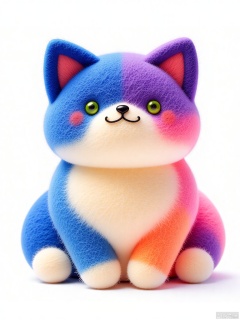 YMZ, a wool felt cat with fur in a whimsical gradient, beginning with deep blue at the head and transitioning through purple, pink, peach, and finally white at the paws. The cat has bright green eyes and a mischievous expression. The white background makes its colors even more striking.