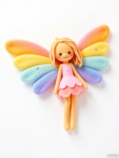 YMZ, a wool felt fairy with wings in a dreamy gradient, starting from shimmering gold at the tips and blending through soft pink, lavender, light blue, and finally clear like the morning sky. The fairy has sparkling eyes and a delicate, ethereal presence. The white background makes her look like she's just descended from the heavens.