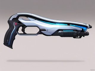 QXL, Digital artwork of a futuristic, high-tech handgun with a sleek, metallic design. The gun features a silver and black color scheme with blue accents. The grip is ergonomic with a textured black handle. The weapon has a slide and a magazine well. The background is a gradient of grey to white, giving a sense of depth. The gun is positioned horizontally, showing the side view. The image is clean and detailed, with a focus on the weapon's design and functionality.