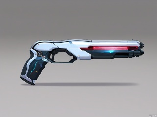 QXL, A high-quality digital illustration of a futuristic, sci-fi weapon, resembling a handgun. The weapon has a sleek, metallic design with a black grip and silver accents. It features a long barrel with a red tip, suggesting it's a laser or energy-based weapon. The background is a gradient from light grey to white, giving a sense of depth. The image has a smooth, polished look with a shadow underneath the weapon. The weapon is angled slightly to the right, showing off its design.