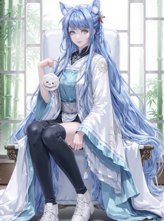 The image is an illustration of a character with anime-style features, predominantly in shades of blue and white. The character has large eyes, blue hair, and is wearing a traditional Chinese dress with a high collar and decorative patterns. The character's pose is relaxed, sitting on a chair, with one leg crossed over the other. The background suggests a serene, possibly historical setting with bamboo and a window that frames the scene. The overall color palette is soft and pastel, contributing to the image's tranquil atmosphere.1girl, solo, long hair, looking at viewer, smile, open mouth, bangs, blue eyes, hair ornament, thighhighs, long sleeves, dress, ribbon, holding, animal ears, twintails, sitting, very long hair, blue hair, full body, braid, frills, detached sleeves, shoes, black thighhighs, wide sleeves, hair bun, white dress, aqua eyes, sleeves past wrists, double bun, aqua hair, chinese clothes, stuffed toy, white footwear, stuffed animal, frilled sleeves, tassel, china dress, sleeves past fingers,.(all body) (Show whole body),(all body),(artist:quasarcake:0.8),extreme aesthetic,(wlop:0.6),masterpiece,best quality,good quality,newest,very aesthetic,absurdres,Visual impact,A shot with tension, ultra-high resolution,32K UHD,sharp focus,best-quality,masterpiece,Emotionalization,unconventional supreme masterpiece,masterful details,temperate atmosphere,with a high-end texture,in the style of fashion photography, (Visual impact:1.2),visually striking appearance,impactful picture,offcial art,colorful,splash of color,movie perspective, masterpiece,best quality,amazing quality,very aesthetic,absurdres,best quality,newest